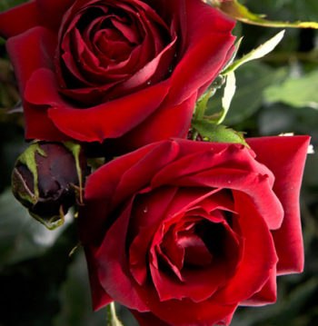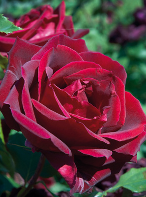 Velours pourpre à reflets noirs. Bouton bien turbiné. Fleur pleine. Ample feuillage vert. Parfum très puissant. Ht : 0,80 m.
